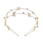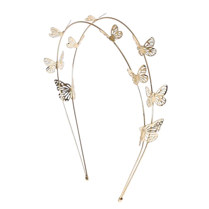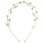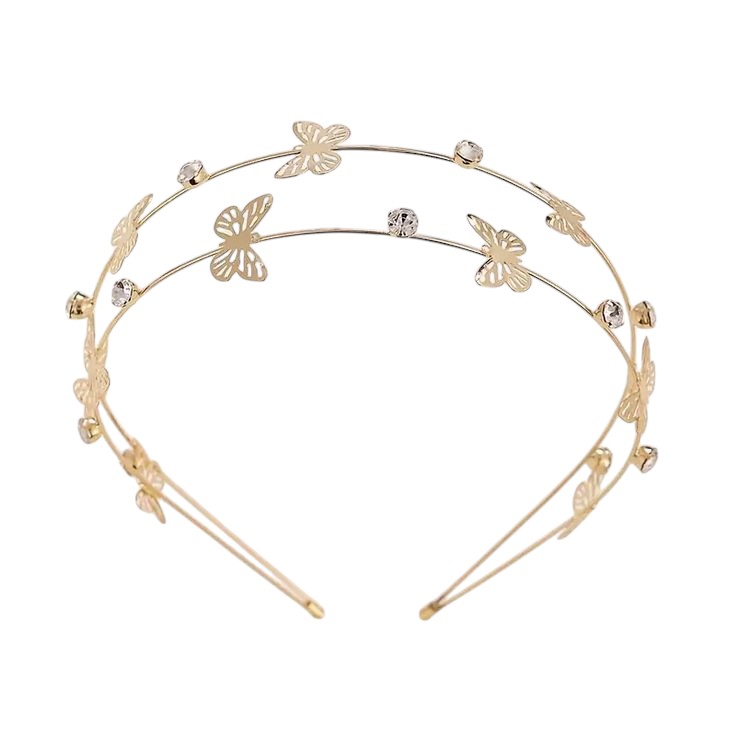 Diadema doble de metal fino dorado con detalle de mariposas y pequeños destellos de cristal engarzado.