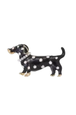 Este broche con forma de teckel en esmalte negro con topitos destaca por su diseño original y lleno de encanto. Perfecto para chaquetas, abrigos, bolsos o mochilas, aporta un toque divertido y sofisticado a cualquier conjunto. Ligero, versátil y fácil de combinar, es el accesorio ideal para amantes de los perros y para quienes buscan un detalle diferente con estilo.