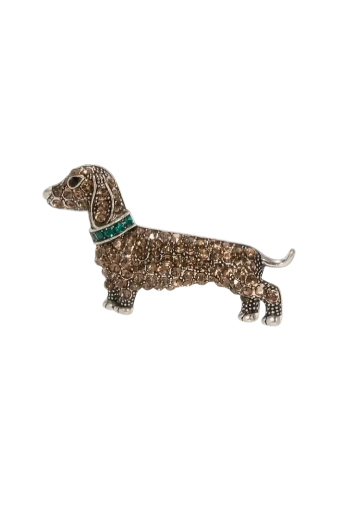 Este broche con forma de teckel destaca por su diseño divertido y elegante, realzado con strass que aportan un brillo sutil y llamativo. Ideal para chaquetas, abrigos, bolsos o mochilas, es un accesorio ligero y versátil que añade un toque original y encantador a cualquier look. Perfecto para amantes de los perros y para quienes buscan un detalle diferente con estilo.