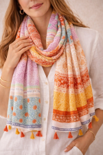El pañuelo estampado étnico multicolor con borlas es un accesorio lleno de color que destaca por su diseño inspirado en patrones decorativos tradicionales. Su combinación de tonos cálidos y suaves crea un estilo alegre y original.