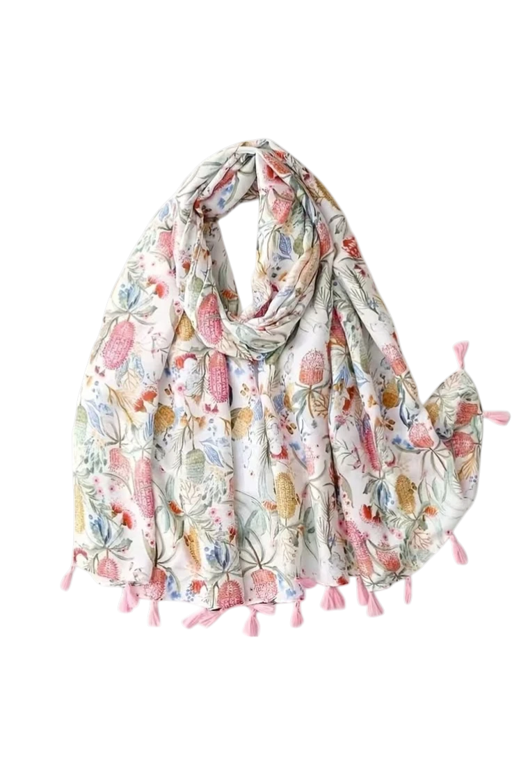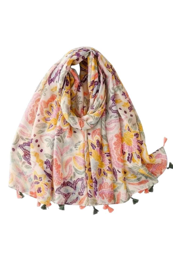 El pañuelo floral multicolor con borlas destaca por su delicado estampado de flores en tonos suaves que aportan un estilo elegante y natural. Su diseño combina colores cálidos y frescos creando un accesorio lleno de armonía.
