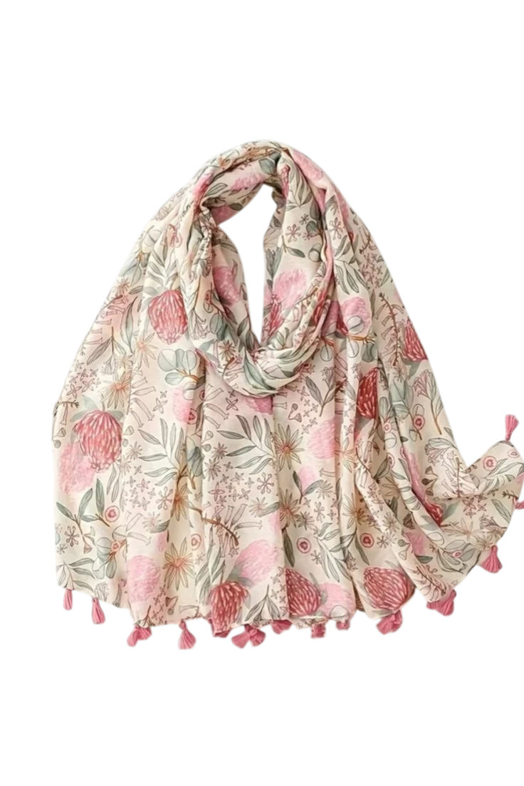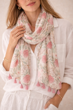 El pañuelo estampado flores rosa con borlas es un accesorio delicado y lleno de encanto que aporta un toque natural al look. Su diseño floral combina tonos rosados y verdes suaves sobre una base clara, creando una pieza femenina y armoniosa.