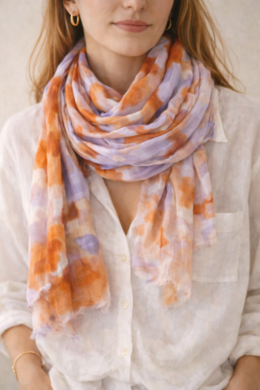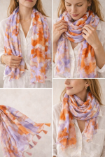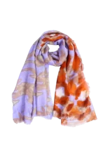 El pañuelo estampado en tonos lila y naranja es un accesorio ligero y lleno de personalidad que aporta un toque moderno y colorido a cualquier look. Su diseño combina un estampado abstracto con contrastes suaves que crean una pieza original y fácil de combinar.