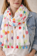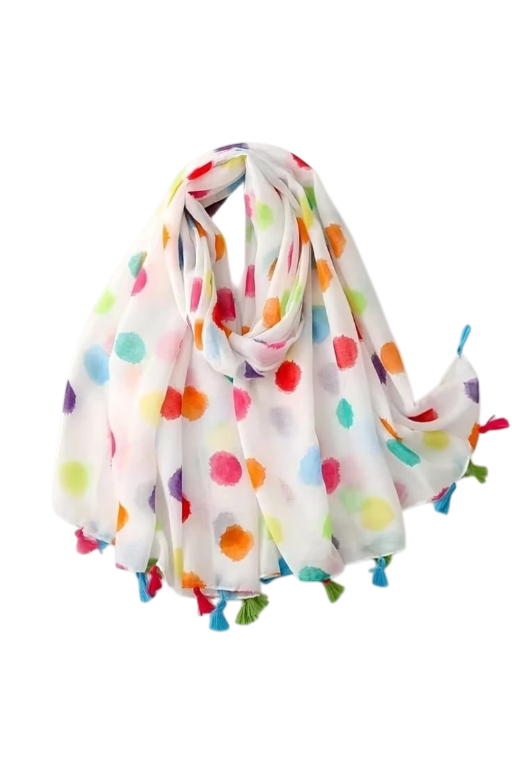 El pañuelo blanco estampado lunares multicolor con borlas es un accesorio ligero y lleno de color que aporta un toque alegre y original a cualquier look. Su diseño combina una base blanca con lunares en distintos colores que crean un estilo fresco y divertido.
