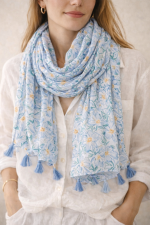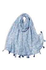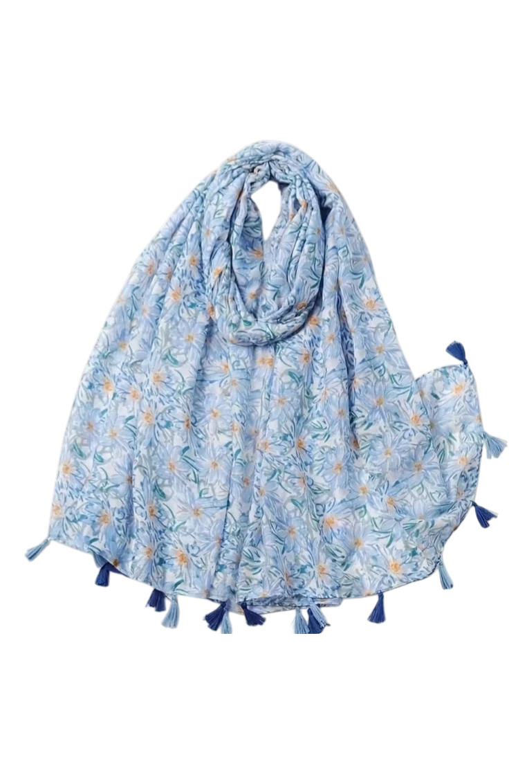El pañuelo azul claro estampado floral con borlas es un accesorio ligero y delicado que aporta un toque fresco y elegante a cualquier look. Su diseño combina un suave tono azul con un estampado de pequeñas flores que crea un estilo natural y femenino.
