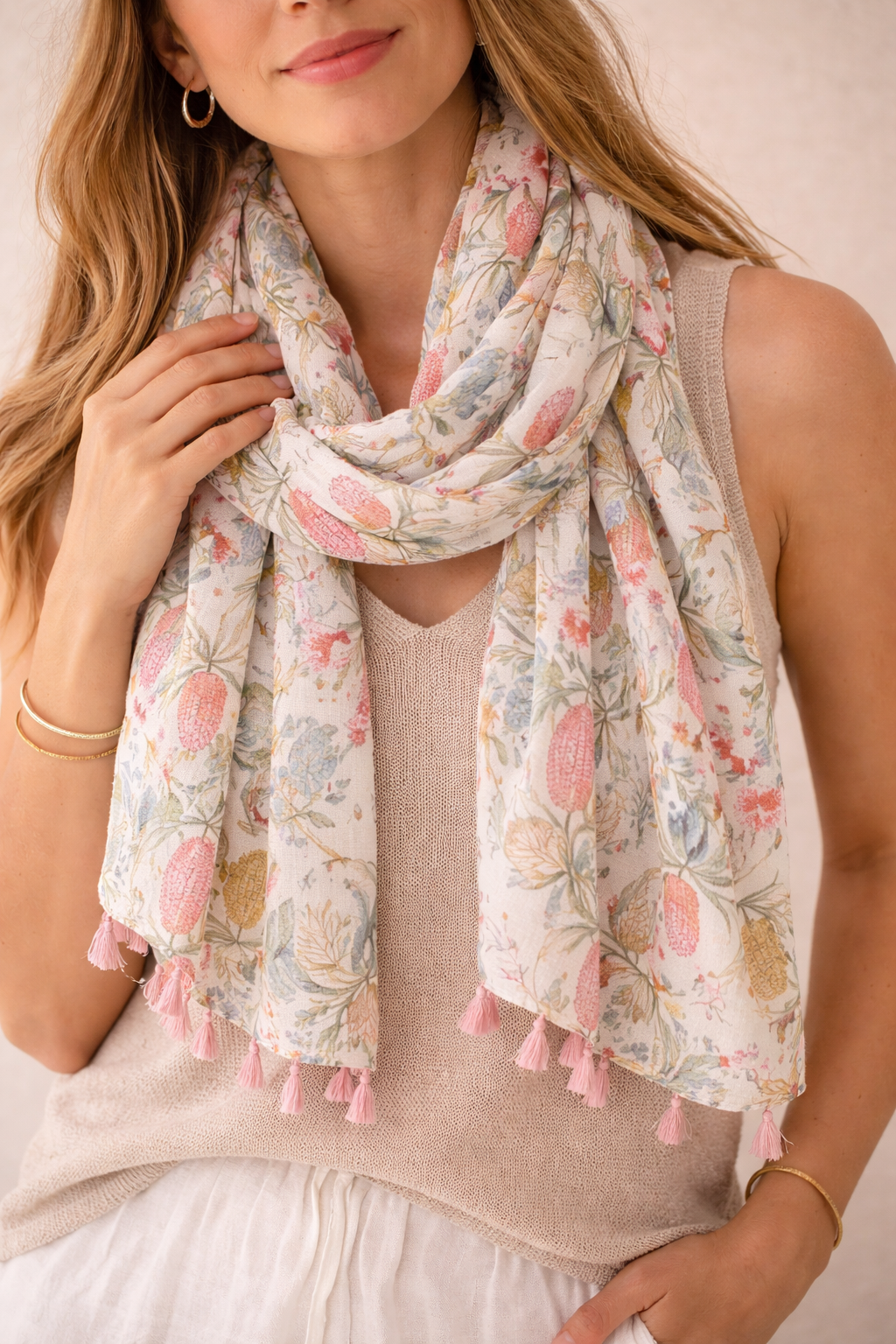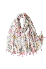 El pañuelo estampado botánico multicolor con borlas es un accesorio delicado que destaca por su diseño inspirado en flores y elementos naturales. Sus tonos suaves y variados crean un estilo fresco y elegante que aporta personalidad al look.