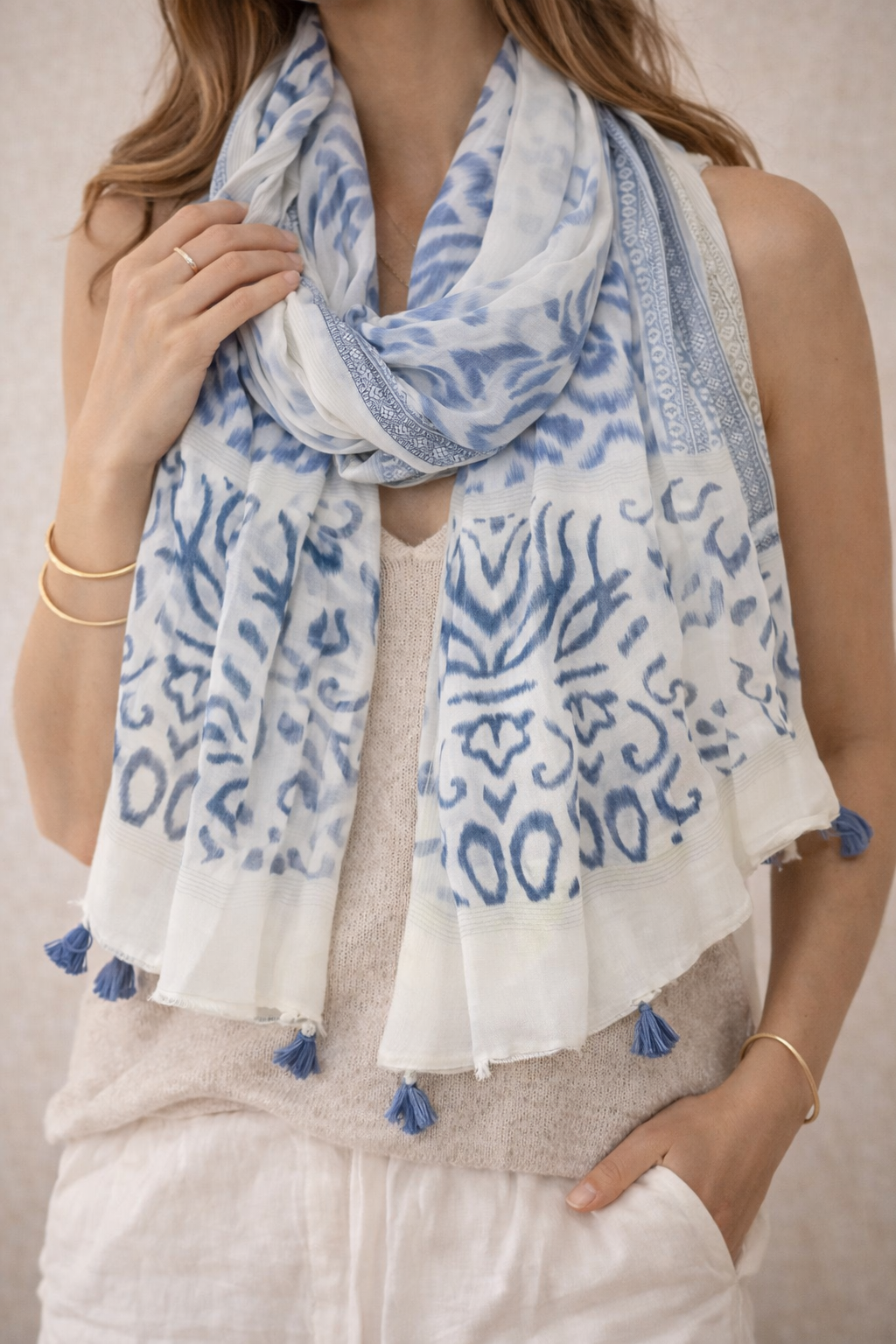 Las borlas en los extremos añaden un toque decorativo que realza el diseño y aporta movimiento a la pieza.