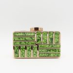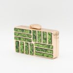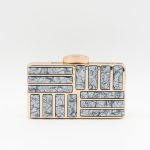 Bolso de fiesta de formato rígido con incrustaciones efecto nacarado en patrón geométrico y estructura metálica en tono dorado.
