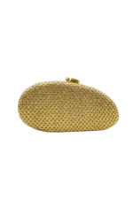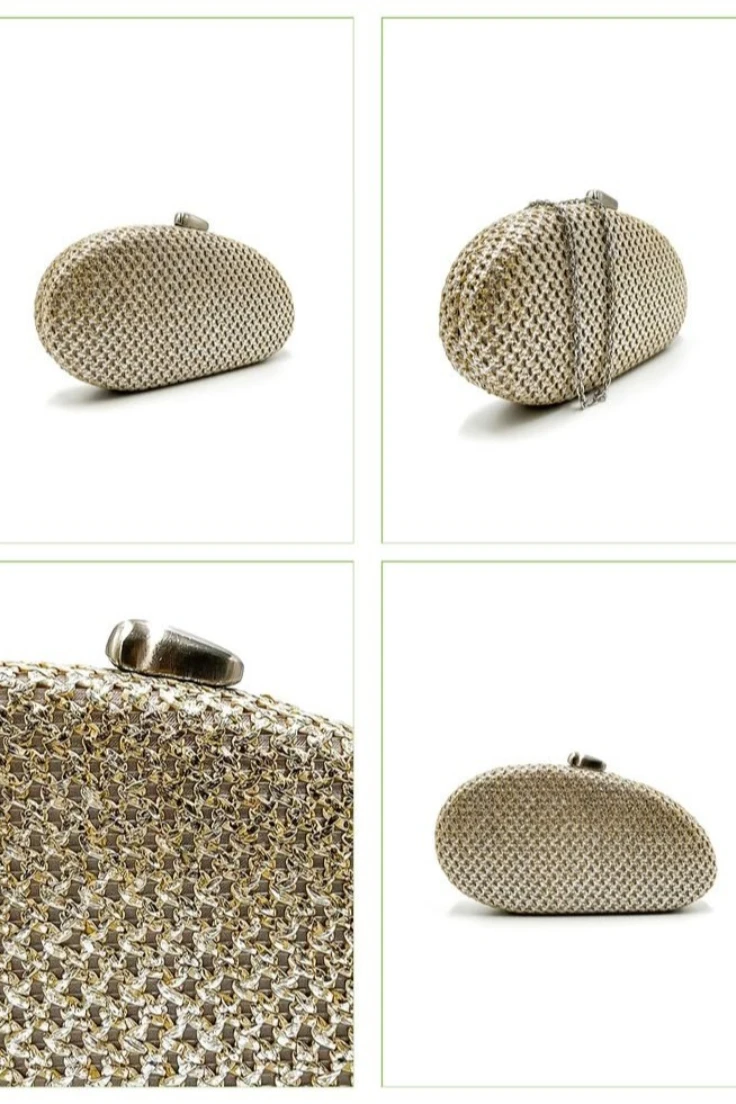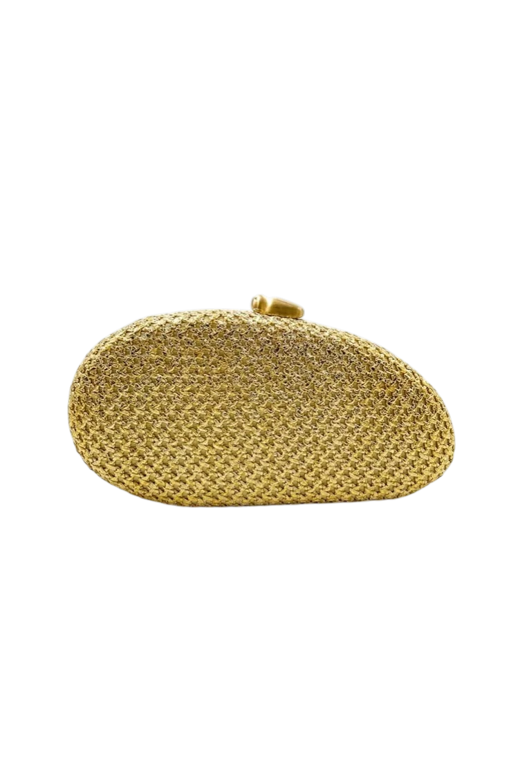 El bolso clutch ovalado en rafia metalizada dorada es el complemento ideal para elevar cualquier look de invitada. Su diseño elegante y luminoso lo convierte en una pieza perfecta para eventos y celebraciones.