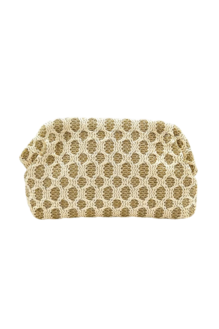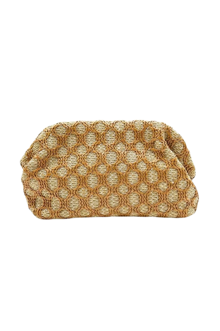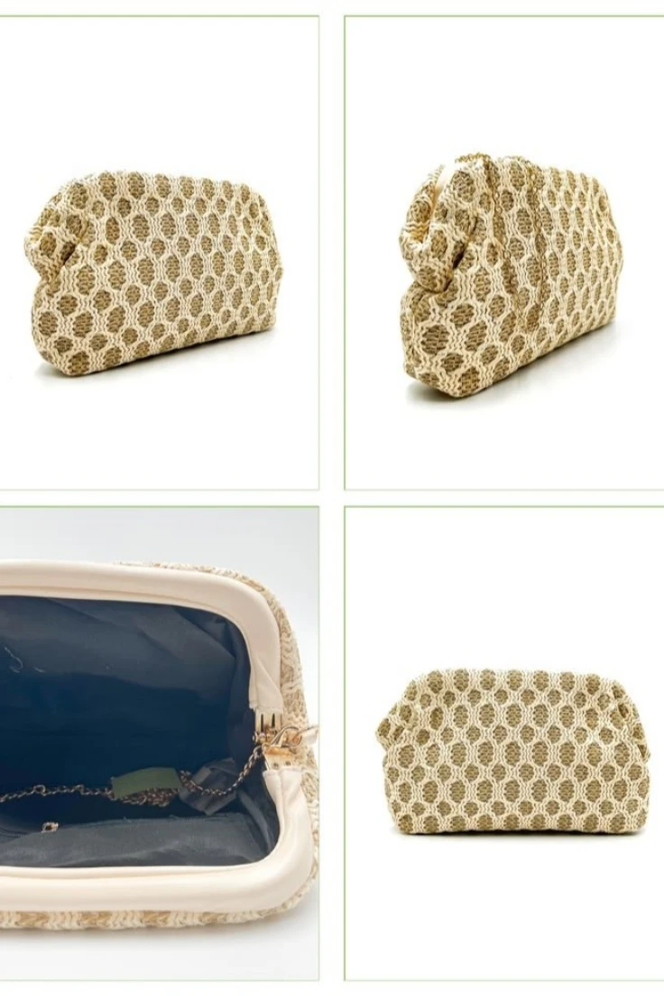 El bolso clutch de rafia calada es el complemento perfecto para invitadas, celebraciones y eventos especiales. Su diseño con textura natural aporta un toque elegante, fresco y actual a cualquier estilismo.