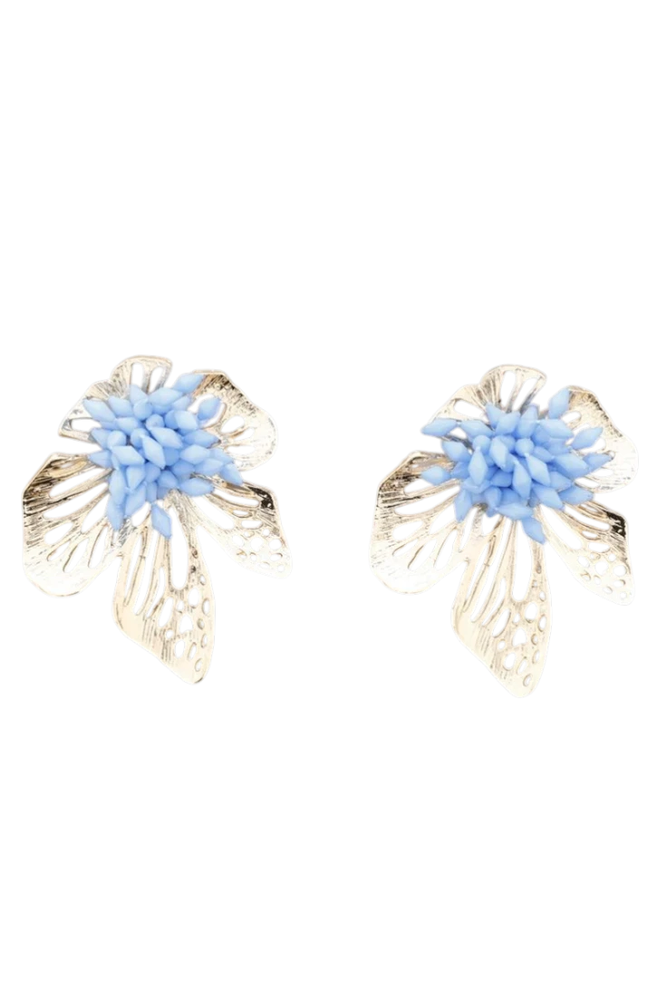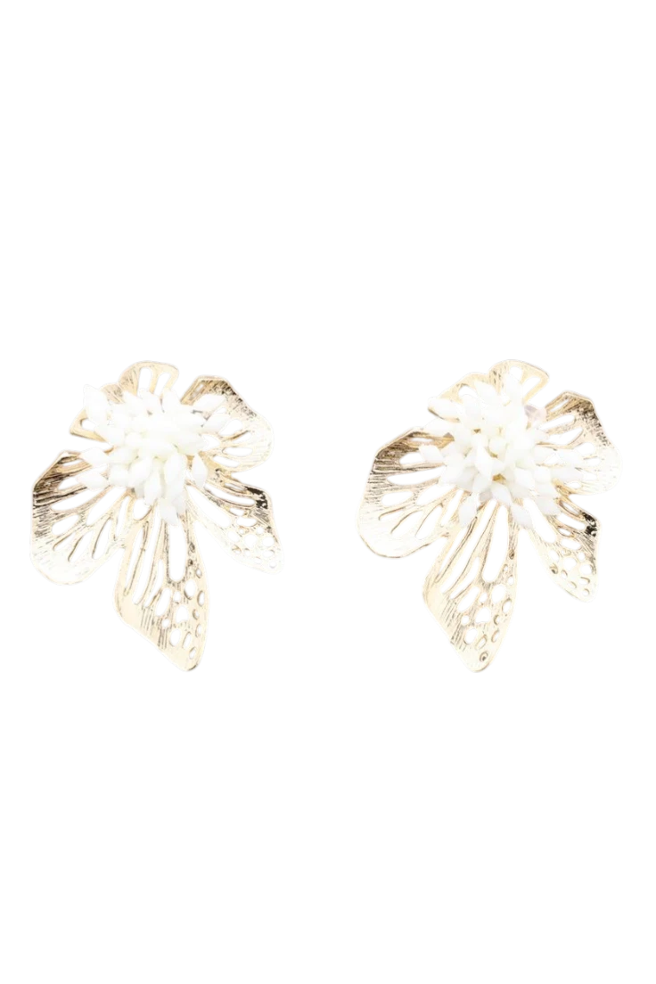 Pendientes con forma de flor en metal y detalles de beads acrílicos con un ligero brillo en el centro, elegantes, favorecedores y llenos de estilo. El complemento perfecto para completar tu look tanto en tus looks más casuales o bien en bodas, celebraciones o eventos especiales.