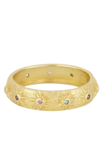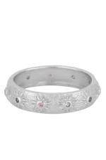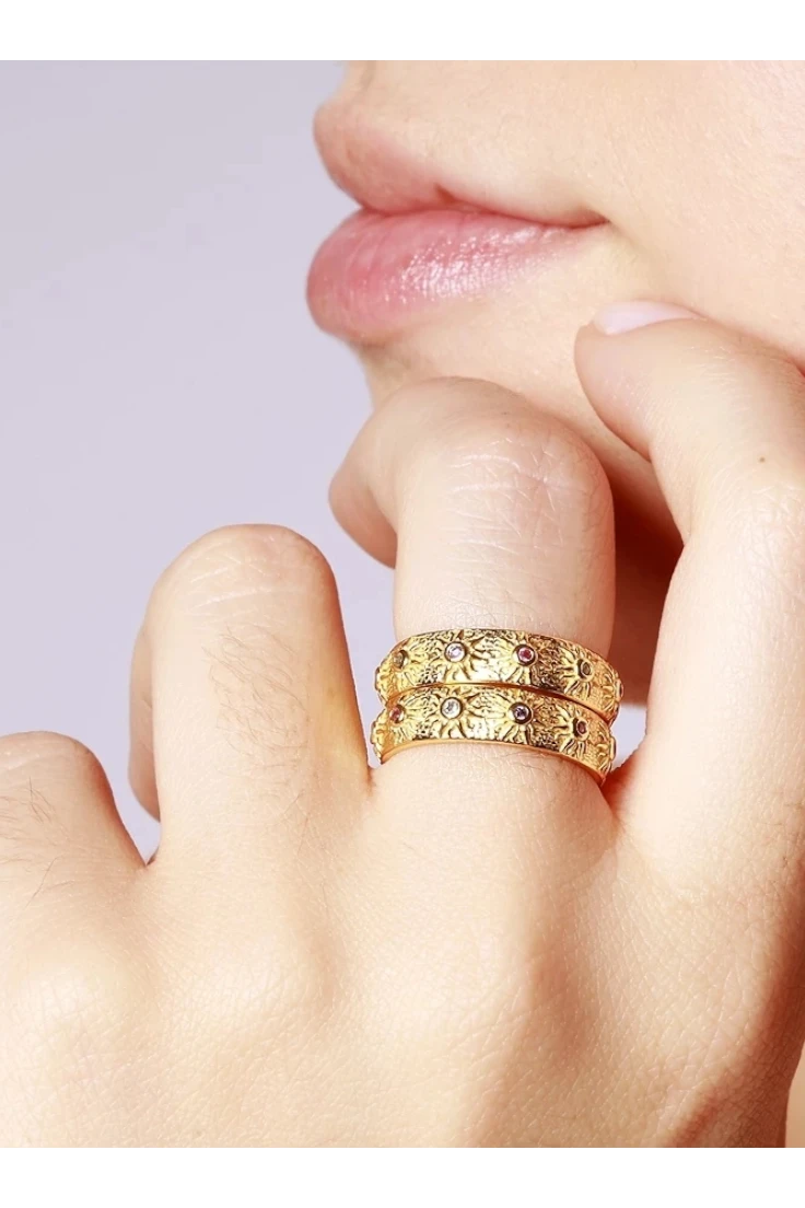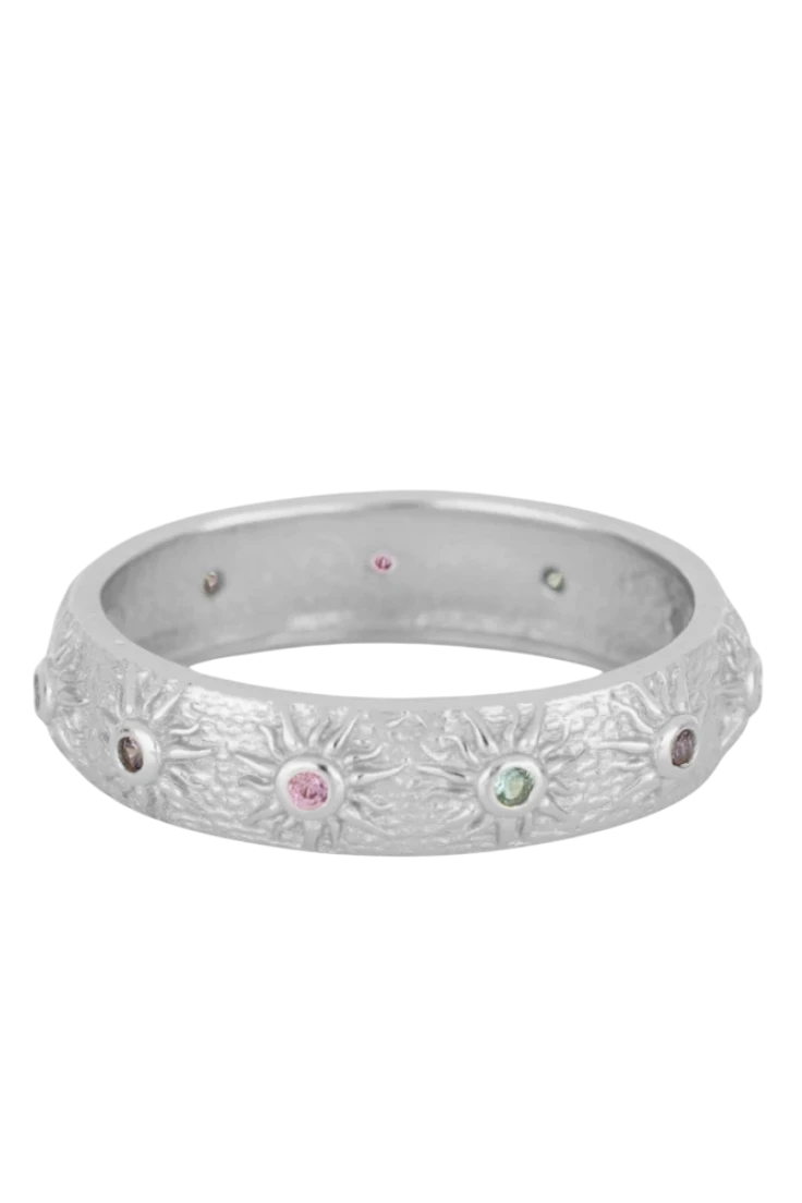 Este anillo de 5 mm de ancho destaca por su diseño de soles con circonitas de colores en el centro, aportando brillo y un toque vibrante a cualquier look. Su estilo alegre y luminoso lo convierte en una pieza ideal para el uso diario o para dar un acento original a tus combinaciones. Un anillo llamativo y versátil que combina diseño, color y personalidad.