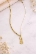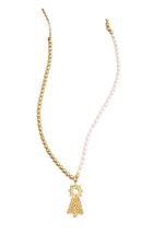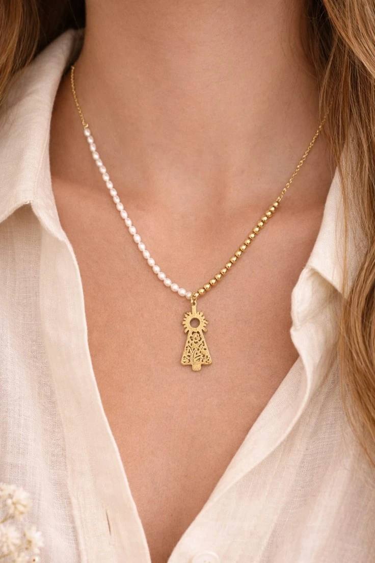 Este collar combina la suavidad natural de la perla de río con delicadas bolitas chapadas en oro 18K y un colgante de la Virgen del Pilar, creando una joya elegante y llena de significado. Su diseño femenino y atemporal lo convierte en el complemento perfecto para el día a día o para ocasiones especiales. Ideal como regalo con valor emocional, es una pieza luminosa y versátil que aporta distinción, espiritualidad y estilo a cualquier look